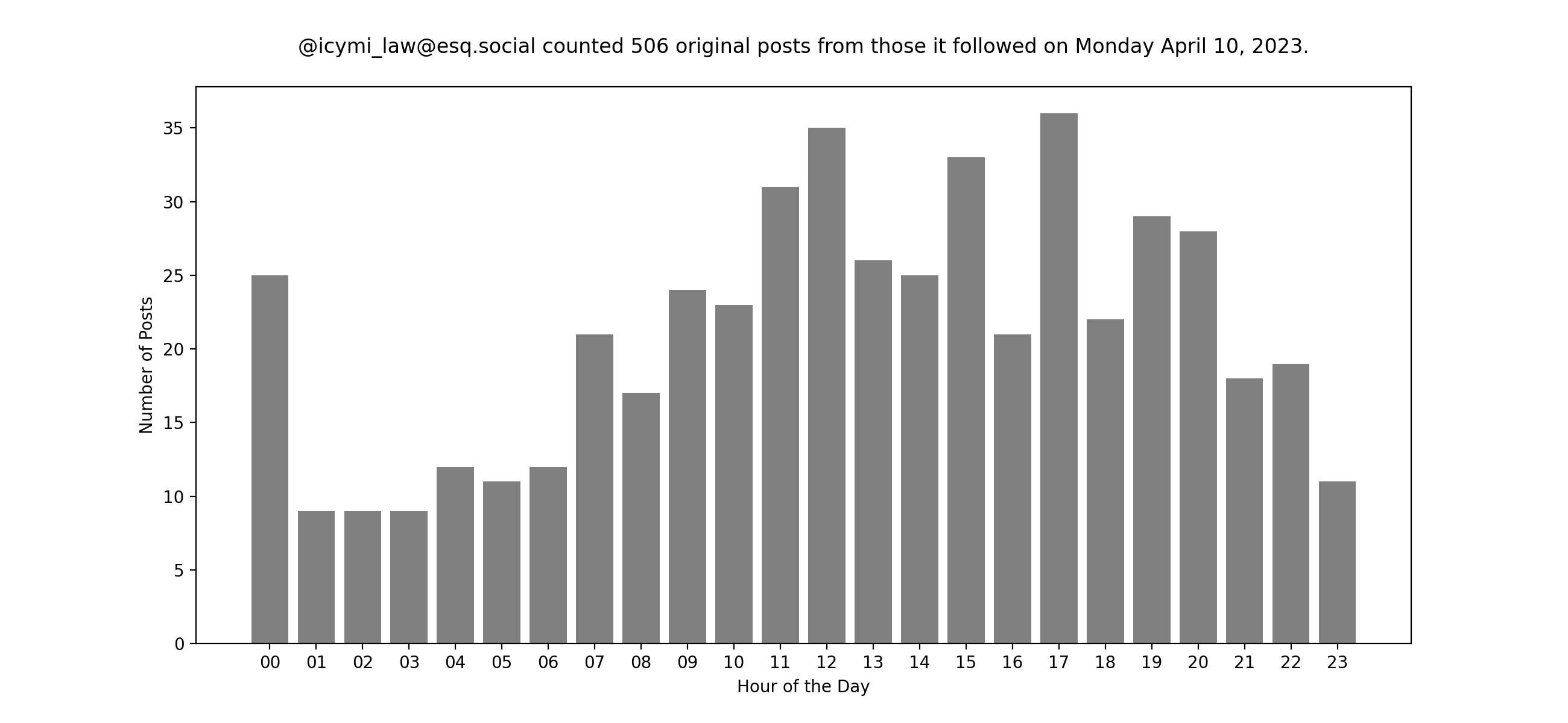 Of course, these insights are all thanks to a community of users, namely the folks I follow over at @icymi_law@esq.social. For fun, here's a look at their posting traffic yesterday. I like trying to create stories about the daily ups and downs. What is that bump? ;)Search
