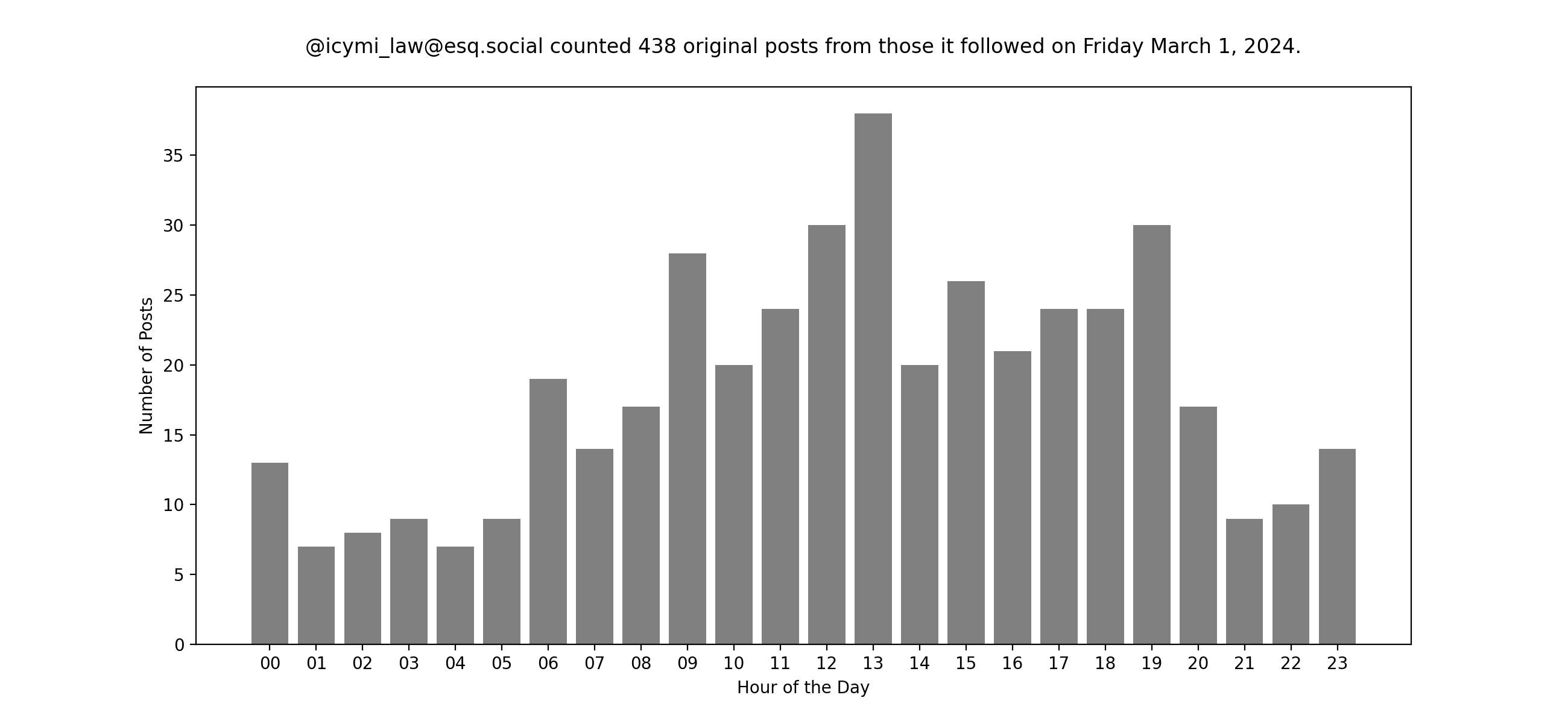Of course, these insights are all thanks to a community of users, namely the folks I follow over at @icymi_law@esq.social. For fun, here's a look at their posting traffic yesterday. I like trying to create stories about the daily ups and downs. What is that bump? ;)Search