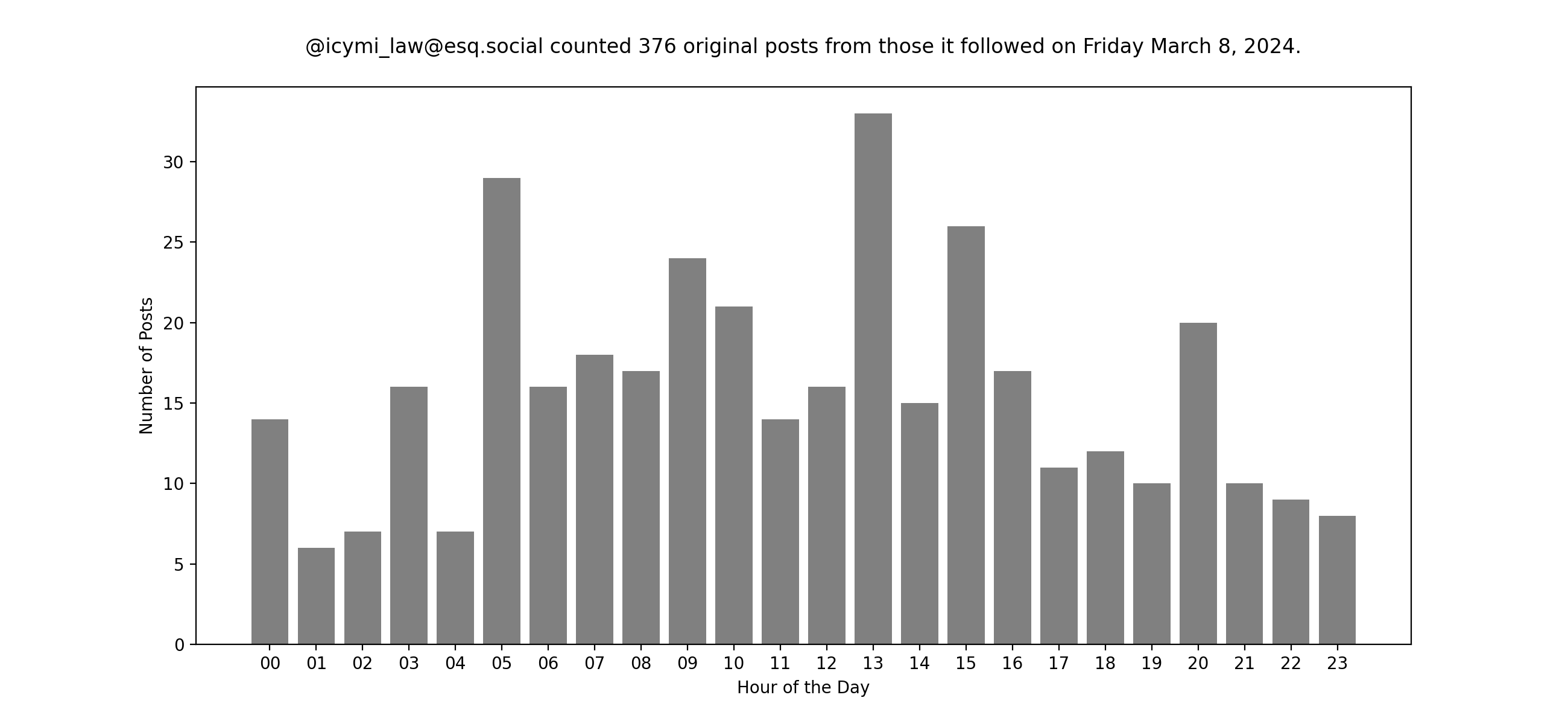 Of course, these insights are all thanks to a community of users, namely the folks I follow over at @icymi_law@esq.social. For fun, here's a look at their posting traffic yesterday. I like trying to create stories about the daily ups and downs. What is that bump? ;)Search